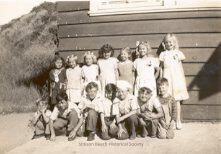 This black and white photograph is of fourteen children. Seven girls are standing in the back row and they are arranged (from right to left) from shortest to tallest. Seven boys are crouched or kneeling in front of the girls. They are all smiling and looking at the camera and are posed before the side of the schoolhouse.Collection