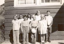 This black and white photographic print depicts eight children standing four abreast in two rows. In the front row, left to right, are three boys and a girl on the end. The back row, left to right, is made up of two girls and two boys. The third boy to the right in the front row is holding a sailor cap in his hands. The schoolhouse siding is in the background with the bottom of a window showing just above the children's heads.Collection