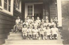 This black and white photograph is of eighteen children sitting in three rows on the steps of the school. The blonde girl in the first row on the right, with a bow in her hair, is Barbara Smith. The entrance to the school is behind them while beside them is the wall of the school with white trimmed windows.Collection