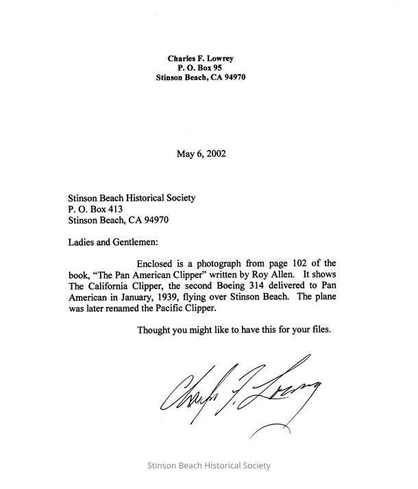 Photograph of the letter accompanied 2002-308-01. It describes the photo by the donor. Written: Enclosed is a photograph from page 102 of the book, "Pan American Clipper, " written by Roy Allen. It shows the California Clipper, the second Boeing 314 delivered to Pan American in Jan. 1939, flying over Stinson Beach. The plane was later renamed the Pacific Clipper. See 2002-308-01.Collection