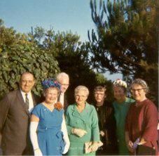 This color photographic print shows a group of seven people, from the hips up, standing in front of some shrubbery. They are dressed for a wedding, the men wearing suits and the ladies hats and gloves. The man on the left (Joe Blazer) is in a brown suit. The woman standing next to him (Billie McCarthy) is in a blue dress, a blue flowered hat, white full-length gloves and a red corsage. Next to the right is a man in a dark suit (Bill Woodington). Next to him is a lady in a mint green suit (Marge Woodington) and next to her is Margaret Rolly, standing partially in the shade and wearing a dark suit. The woman next to Margaret wearing green and a white flowered hat is unidentified and next to her is Louise Airey wearing a deep red suit and carrying a black purse.Collection