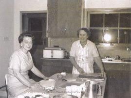 This black and white photographic print show two women at a kitchen table. The woman on the left (Dorothy Carlson) is sitting at the table with a book (cookbook?) open in front of her. The woman on the right (Louise Airey) is standing at the end of the table with a sheet cake in front of her. Behind them is a kitchen sink with a window over it, a kitchen cabinet over a counter, and a door.Collection