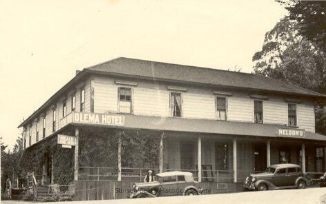 B&W photo shows a 2-story building that has 2 signs on the roof overhanging the first floor. The sign on the left corner reads "OLEMA HOTEL" and faces outward in two directions. The other sign reading "NELSONS" is on the right end of the building. The front of the hotel has an overhanging roof supported by wooden poles, giving the impression of a wraparound porch. Attached to the corner pole is a sign that says MEALS/BEER WINE. There is a short staircase up to the porch on the left side of the hotel with vines growing on either side. The second floor has curtained windows on both sides of the building (5 on one side, 8 on the other). The lower floor also has several tall windows. Two vintage automobiles are parked in front of the Hotel and one person is standing behind the hood of one of them facing the camera. On the back of the photo is written "Louise Airey, Stinson Beach, 1920's circa."Collection