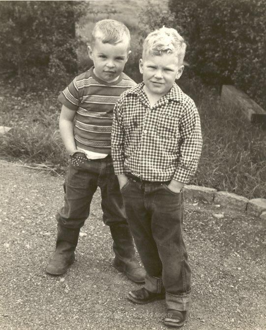 This original black and white photograph shows two boys, full length, of 4 or 5 years, standing on a gravel path. The boy on the left, (Scott Kransler) is wearing a striped T-shirt, pants with western design in rivets on the pocket and boots. He has a hand thrust into the pocket and has smudges on his shirt and face as if he had gotton into the jam pot. The boy on the right (Mike Doyle) has his hands in the pockets of his jeans also. He is wearing a checkered shirt and sandals. Both boys are blond but Scott's hair is straight and Mike's is curly. Both are looking at the camera. They are too cute!Collection
