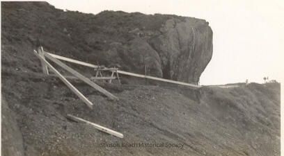 This black and white photograph shows Highway 1 from below. There is a saw horse and some 2 x 4s apparently set up as a safety barrier but the 2 x 4s are sliding down the embankment and the dirt is sliding away exposing the undercut surface of the highway.Collection