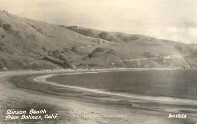 This sepia postcard is a view from Bolinas across the bay to Stinson Beach. A few structures can be seen in the hills and along the beach. Highway 1 is visible coming down to Stinson Beach from the right. 'Stinson Beach from Bolinas, Calif.' is written in white ink in the left hand lower corner. 'Jan 1859' is written in the right hand corner.Collection