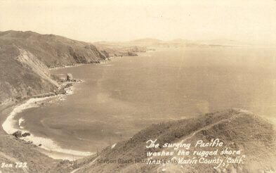 This is a postcard in sepia showing a panoramic view of the Marin County Coast. Printed in the lower right hand corner is "the surging Pacific washes the rugged shore line of Marin County, California." The coastline with steep cliffs falling to the ocean is on the left. On the back of the card is the postmark from Stinson Beach, Cal. dated Jul. 23, 1949. It is addressed to Miss Beulah Baird, Allta Bates Hospital, Berkeley, Cal. Written note says, "Friday, Down at Post Office & just received a note from Peggy - So sorry to hear of your sickness - hope by this time you are feeling a little better. With Love, M L Pepper." -Minnie Legge Pepper, mother of Peggy Pepper, lived at the cottage on Laurel Av. where Peggy moved after her retirement , 1971 to 1993 when she moved to the Redwood Retirement Community in Mill Valley. (tsa)Collection