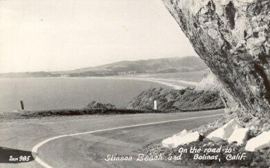 This is a black and white panoramic view of the road to Stinson Beach. Printed in the lower right corner is "On the road to Stinson Beach and Bolinas, Calif." The road curves from the lower left toward the right. There is a large overhanging rock in the left foreground. Beyond the road in the background can be seen the Bolinas Bay with the sandspit extending toward Bolinas and beyond the sandspit the Bolinas Lagoon is visible.Collection