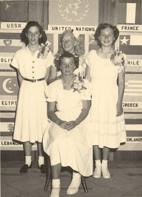 This original black and white photograph is of four girls, three standing and one seated, in front of a back drop depicting various international flags as well as the flag of the United Nations. The girls are wearing white (or light) dresses and corsages pinned to their shoulders. The girl on the left is Lola Mancha. Standing next to her is Joan Dittmar and next to her is Jean Ann Curr. The girl seated in front is Betty Johnson.Collection