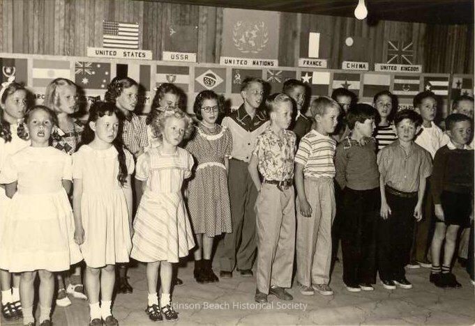 A black and white photographs shows 19 children of the Stinson Beach School elementary class in a group photo for their graduation. They are posed in front of a display of the flags of the United Nations. Most of the boys are wearing sneakers, tucked in jersey shirts and pants except for one wearing a Western shirt and one boy in short pants. From left to right in the back row is Marla Schlinger with a ribbon in her dark hair, then 3 unidentified girls, a blond and 2 brunettes, Jeanne Bartlett with glasses and wearing a polkadot, puffed sleeve dress, Todd Bartlett with the Western shirt, Dick Curr half hidden behind boy in striped shirt,, Aden Jakes, an unidentied boy in a striped shirt, Gary Upton and one more unidentified boy in the rear. The front row has a girl with ribboned braids in her hair, then Sue McCleran with long dark hair, Diane Smith, a curly haired blond. These girls have similar dresses with short sleeves and above the knees in length. The last five boys in the front row begin with Dick Davidson, Bill Steele, Mike McCleran and Tom Curr (in short pants).Collection