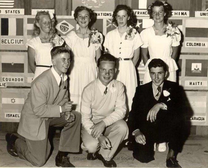 This is a black and white picture of the 1949 graduating class from Stinson Beach School. There are three boys kneeling in the front row and 4 girls standing in the back row. The girls are in white dresses and wearing shoulder corsages, and the boys have white buttonieres.Collection
