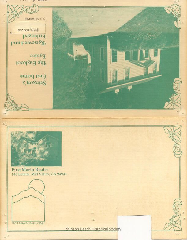 A brochure printed in green ink on white card stock for the purpose of selling the home. The realty is First Marin Realty, 145 Lomita, Mill Valley, Ca 94941. The front page has the photograph of the house after the extensive remodeling in 1980, with paved driveway in front. The caption reads: Stinson's first home, the Easkoot Estate, Renewed and Enlarged $395.000.00. 3 1/2 acres. Inside of the folio has 3 interior shots of the house. It reads: Circa 1870 on top. Under the first photo, it describes the style of the home and the location and the view it has. Under the 2 smaller photo, it describes in more detail the finish , bedrooms, ceiling and style of the home. On the bottom the contact information and the phone number is printed. This portion is somewhat obscured because a part is cut out.Collection