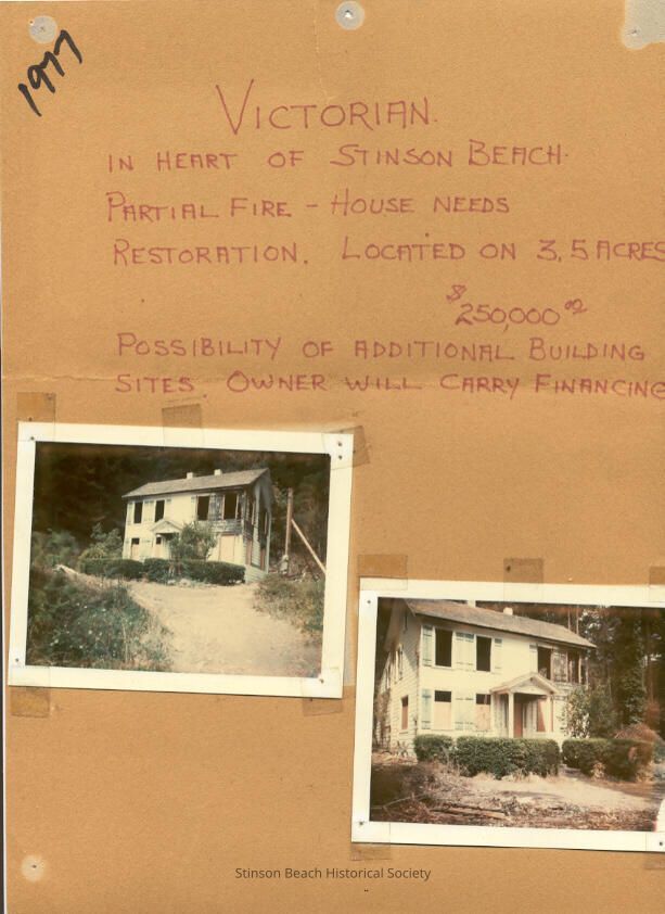 Hand made sign on orange colored paper. Written in red ink:Victorian in heart of Stinson Beach. Partial Fire - House needs restoration. Located on 3.5 Acres. $250,000.00. Possibility of additional building sites. Owner will carry financing. 2 photographs, 2004-122-01 and 02 (filed in Photo Collection) were pasted. On the corner 1977 is written in black pen.Collection
