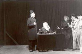B&W photo shows a judge in long white wig and black robe seated at a table looking at a group of three people (one man stands between 2 women) who appear to be explaining their case. The woman on the left, dressed in a long black dress has her arm out to him in supplication; the man has his had clenched in front of him; and the other female is demure with her head slightly downcast. She is wearing white and has a lacy scarf over her head. The villain stands to the left of the judge, with his right hand over his heart inside his waistcoat. He's dressed in a long black coat and top hat and wears spectacles with a self-righteous look on his face.Collection