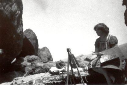 A black and white photographic print of a young woman (Eva Dunn) with an easel and paints for her small canvas. She is neatly dressed, has short curly dark hair and sits with her back to the sun facing large boulders on the beach.Collection