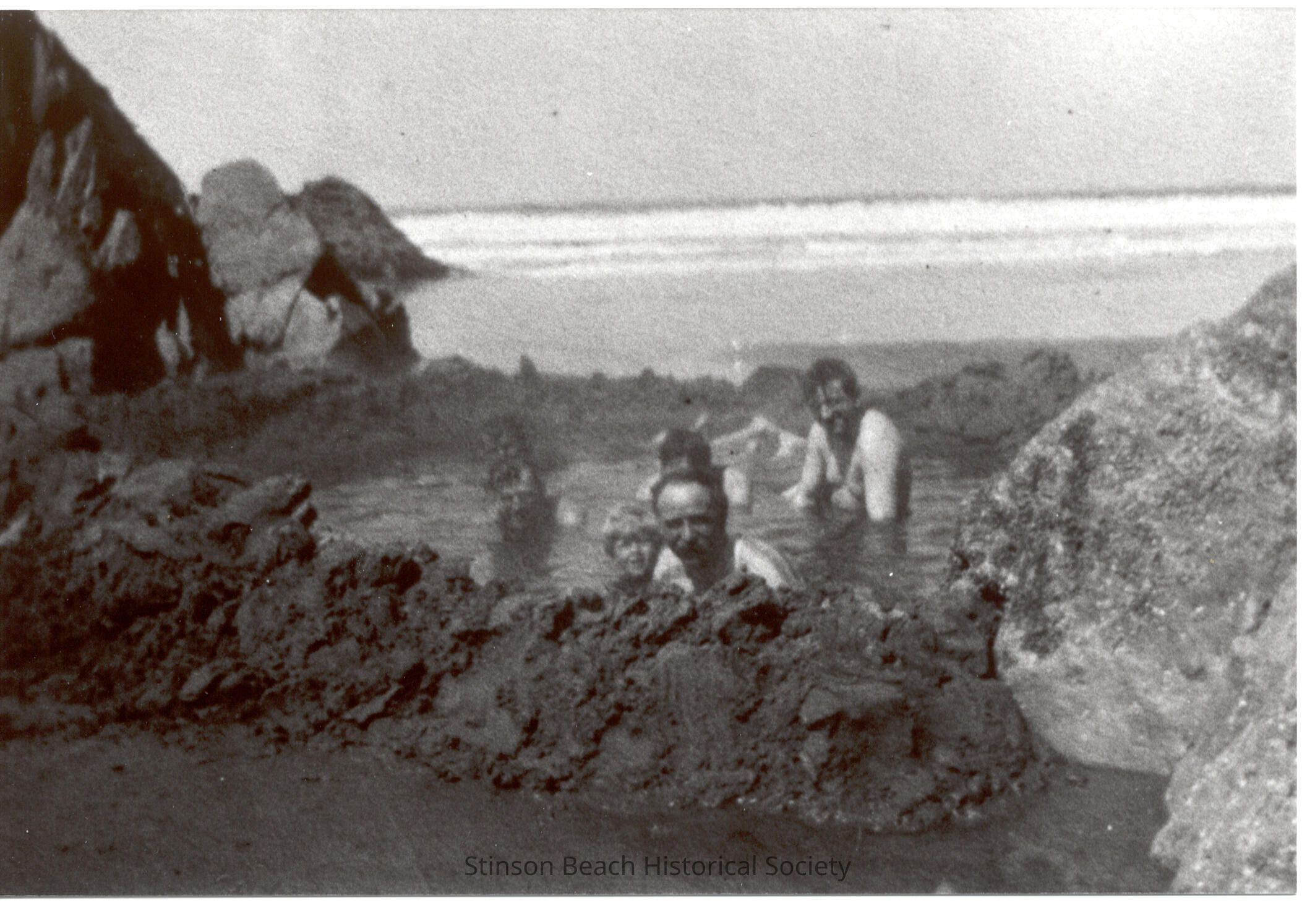 A photograph in black and white taken from the beach, facing out to the Bay. It shows The Rocks which surround a natural pool where warm sulphur water bubbled to the surface and gives obvious enjoyment to the six people, possibly all male, who are sitting in the water. In the foregrouind is Joseph Dunn with a small blond boy to his right. In back of his are four more people; The large rocks frame the pool towards the sea and smaller rocks contour the pool.Collection