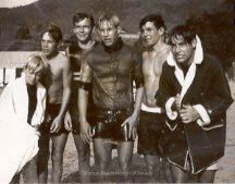 Boys are from the left; Africa, Kit/ Greene, Roger/ Stewart, Craig/ Ferris, Kirby/ Gira, Bernie/ Ferris, Rudi. The photograph was given to the donor, ex-wife of Kirby Ferris, by his father Melton. Kirby Ferris started the town surf shop, Live Water in early 1970's at the Staples Building on Hwy 1. The shop was moved to the Avilla's Barn in 1980. The donor, Millicent Mead, took over the shop in 2001. Rudi Ferris, his younger brother, became the local plumber and known surf fisher. On the back of photo is written in pen: (2) Melton Ferris 460 Meva Albion; Kit Africa-Roger Green- Craig Stewart- Kirby Ferris-Bernie Gira, Rudi Ferris. The front of the photo has crop marks by ball point pen.(ta)Collection