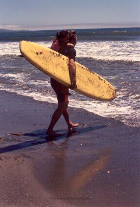 An original color photographic print of Pat Norton and his daughter, Amanda, walking into the surf with a surfboard. Pat who is a GGNRA Park Ranger and a volunteer fireman is holding a yellow long board in his right arm and young Amanda is holding on to his back. The white foam of the surf and the blue Pacific in front of him, wet sand under his feet.Collection