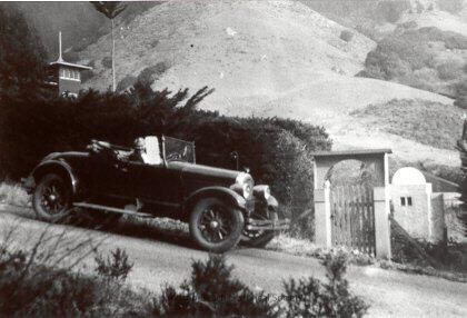 This black and white photo depicts a road with an open top car parked on it facing to the right, pointing downhill. There is a hedge and trees behind it and a gate downhill of it and hills in the background. In the upper right corner part of a house is visible behind the trees. The house appears to have a flagpole on the roof. Below and behind the gate another house is visible with a domed roof. A woman is getting out of the passenger side of the roadster. The door is ajar and her foot is touching the runningboard. The driver (a man?) appears to be moving toward his door on the driver's side. The location is just uphill from Peggy Pepper's house (70 Laurel Ave.).Collection