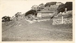 An original photograph of neighborhood along Call del Mar coming down hill near Punte del Mar. Dirt road leading toward the center of the town. The 2 story large house at the center top is Judge Upton's house. 5 other houses shown are unidentified. In front of the road is a large empty field to be filled by the later generations.Collection