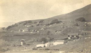 An original black and white photo of the town of Stinson Beach ca. 1913 taken from the hill near Panoramic Highway. Twenty some houses are dotted on the hill. The Airey's Store Hotel can be seen, as well as the Anchorage.Collection