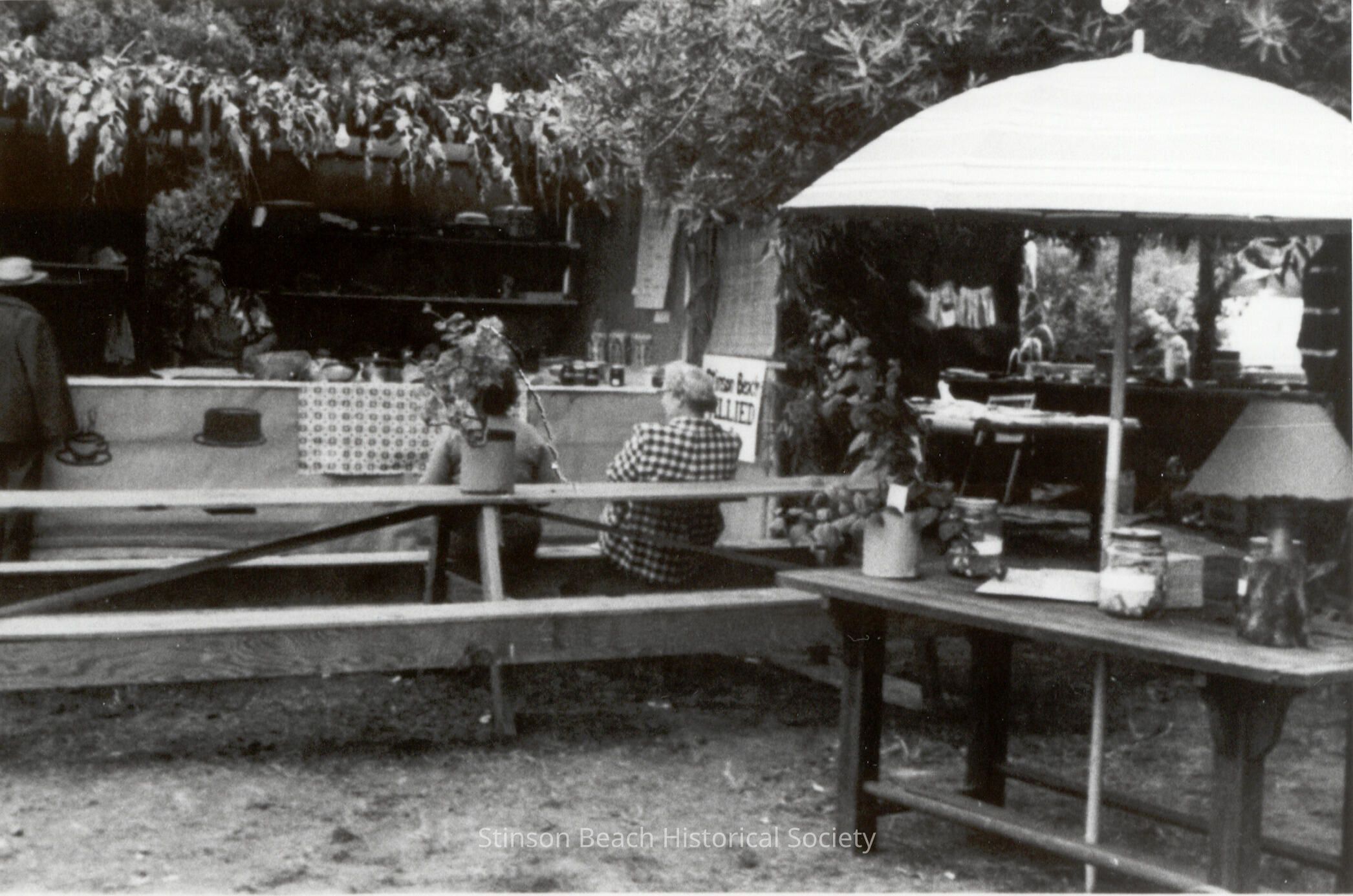 This black and white picture was taken in the courtyard behind the Stinson Beach Community Center. To the right is a table with an umbrella opened above it. On the table is a lamp and other small objects for sale. At the center of the picture two ladies are sitting on a bench with their backs to the camera. They are looking toward other tables in the background containing small objects spread out for sale. There is another person standing to the extreme right of the picture and also looking at the display tables.Collection