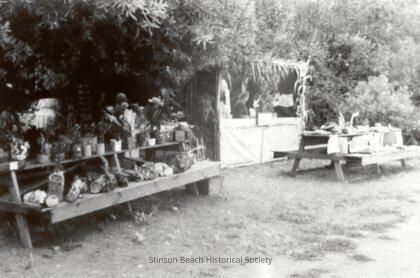 This black and white photograph shows a picnic table with the bench and the surface of the table covered with vases, pots and plantings. To the right of the table is a booth with a woman inside it and at the right of the picture, in front of the booth is another picnic table with items on the table surface and bench. The setting is outdoors with trees in the background.Collection