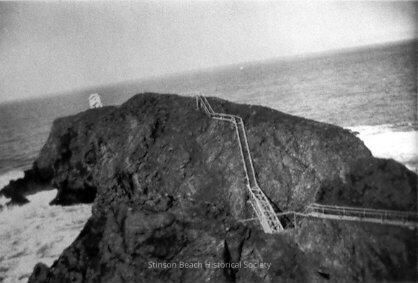 This black and white photograph is of a rocky ridge jutting out into the sea. A walkway/stair has been built on top of the rock leading to the outermost point where the top of a lighthouse can be seen above the ridge. The lower part of the lighthouse is out of sight on the seaward side of the rock. The photo was taken from the land looking out to sea.Collection