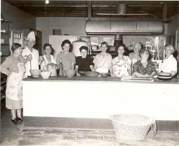 This is a black and white photo taken in a large kitchen. There is a long counter in the foreground with several people standing behind it and facing the camera. There are several bowls and dishes on the counter. Behind the people is the stove top with a large hood above it. There are cooking pots on the stove.Collection