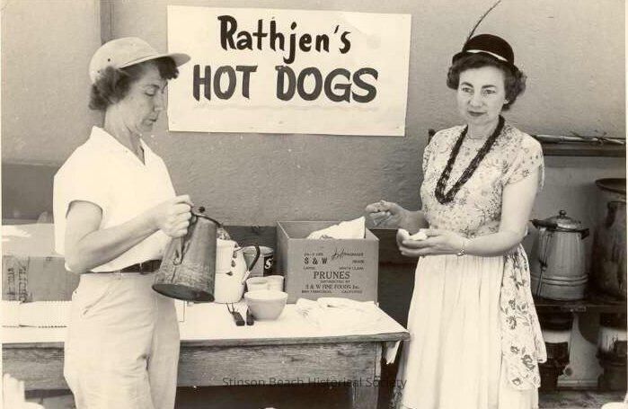 This is a black and white photo of 2 ladies standing in front of a kitchen counter. There is a sign on the wall behind them "Rathjen's Hot Dogs." On the counter between the ladies are some bowls, forks, a pitcher and a cardboard box and a coffee can. The lady on the left is wearing a bill cap and has a coffee pot in her right hand and is pouring coffee into a cup held in her left hand. The lady on the left is wearing a small dark hat with a feather in it. She is holding an open hot dog bun in her left hand and a hot dog in her right.Collection