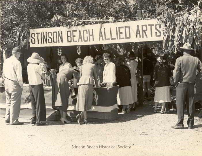 B&W photo shows a banner that reads STINSON BEACH ALLIED ARTS suspended over a long covered table under a grove of trees. There are people on either side of the table. On the far side 4 or 5 women are seated or standing and talking with folks on the other side who are lined up to sign up for something. One woman is bent over the table as if writing something down; another is leaning on the table as she talks to a woman on the other side. Two other folks, a woman in straw hat and a gentleman in a cap, are waiting in line and seem to be conversing with an elderly lady behind the table. There are also more people mingling behind the table and another smaller table to the right where a woman in bandana is standing, as well as a gentleman in a hat with his hands in his pockets.Collection