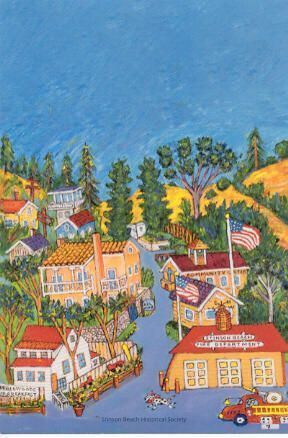 A colored postcard for the Redwoods Bed and Breakfast. It shows a painting of downtown Stinson Beach with the establishment at lower left front and the firehouse in front, at lower right. other recognizable houses follows in back lining the Highway one. Hills and sky (the ocean ?) are behind. The establishment is owned by John Posada and his wife. On the back of the card is printed: The Redwoods Bed and Breakfast #1 Belvedere (Next to fire station), P.O.Box 404, Stinson Beach, California 94970 415-868-9828 or 415-868-1034 www.stinson-beach.com. Environmental Mural. 415-868-2174.Collection