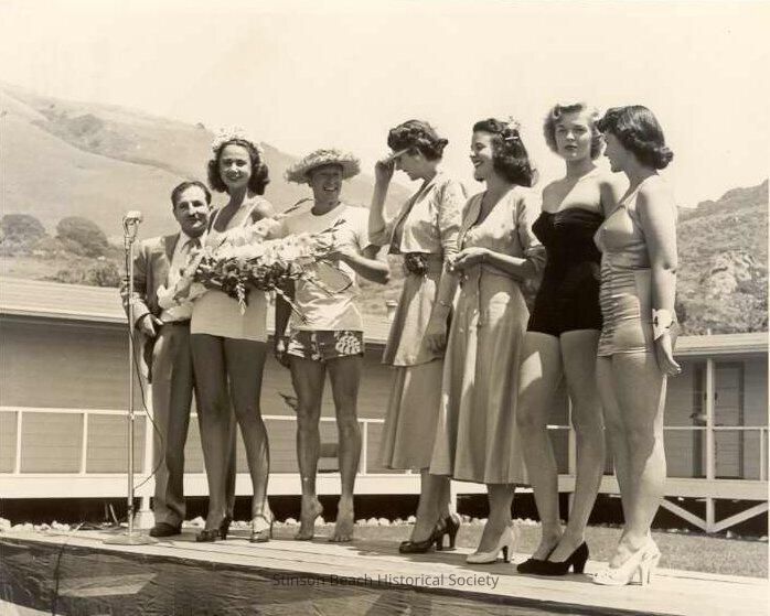 B&W photo of the winner of the Bathing Beauty Contest holding a bouquet of flowers and wearing a floral tiara standing with six other people: (L to R) a short stocky man in a suit with hands on his hips in front of a microphone stands to the left of the "queen;" a smiling man in a sombrero, Hawaiian shorts and white t-shirt stands on tiptoes to her right, looking towards the other 4 females on the outdoor stage; a woman in a belted, below the knee dress with bolero has her hand to her sunglasses; the smiling woman beside her is also in a midi-length dress and has her hands together in front of her. Her dark hair is shoulder length with a fancy barrett holding it in place; the next woman is a short-haired Marilyn Monroe-type blonde in a black bathing suit and is facing the audience. The final woman wearing a light colored one-piece bathing suit has dark medium-length hair and on her wrist is a heart-shaped paper bracelet with a number 4 on it. The stage is outdoors behind a long L-shaped building with a view of the hills in the backgroundCollection