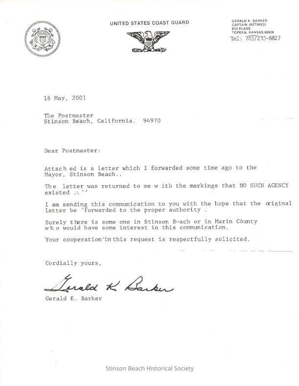 3 page letter from Capt. Barker dated May 16, 2001. The cover letter is addressed to the Postmaster, Stinson Beach looking for a party interested in communicating to him about the life of Coast Guard stationed at Stinson Beach. The second and the third page is the copy of the original letter dated May 6, 2001, he addressed to Mayor of the town. Letter describes the life and activity of the Coast Guard unit stationed Stinson Beach during WWII.Collection