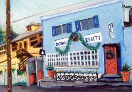 A colored greeting card sent for the 2004 Holiday. It shows an acrylic painting done by Sarah Butler, one of the employees, depicting the blue Oceanic Realty building with Christmas decorations next to the yellow building which housed Meristem flower and gift shops. Inside a message reads, "Season's Greetings from the crew at Oceanic Realty".Collection