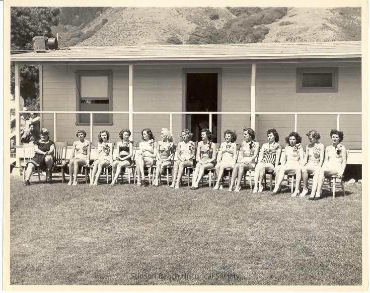 This is a black and white photo showing 14 young women seated in a row on the lawn in front of a one story wood frame building. They are wearing bathing suits and high heels. At the far left of the building and behind the girls are three men.Collection