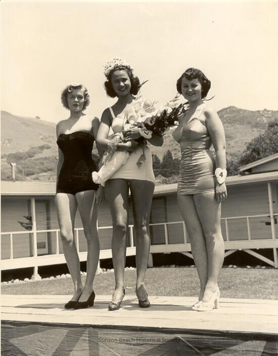 This black and white original photograph shows three young women in bathing suits standing on a platform. The woman in the center is wearing a white bathing suit and a floral tiara. She is holding a large bouquet. On her right is a young woman in a black one piece swim suit and on her left is a young woman in a one piece suit of unknown color. The contestant number of the winner (center figure) is 7. The woman on her left has a number 4 on her wrist. The number of the other runner up is not visible.Collection