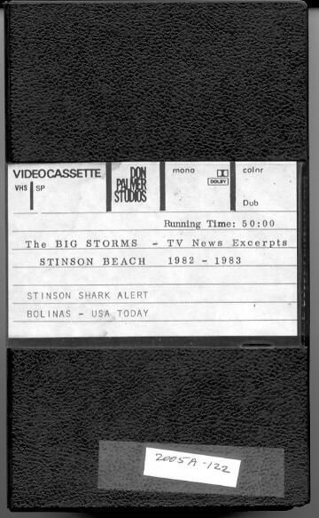Video cassette of excerpts from TV News during the storms of 1982 to 1983 and others including Stinson Shark Alert, Bolinas-USA Today. Created by Don Palmer Studio. Running time 50 minutes.Collection