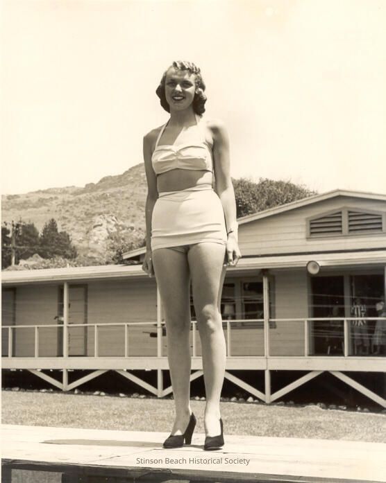 This black and white original photograph shows a young lady in a light colored two piece swim suit and dark high heels standing on a platform. There is a wood frame house with a veranda in the background.Collection