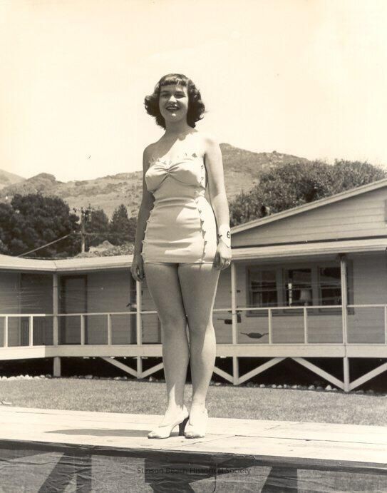 B&W photo of a smiling brunette with bangs in a light one-piece bathing suit and heels standing, arms at her side, on a platform in front of a long single-level building. She is also wearing a paper bracelet with a #6 on it. There are hills in the background with trees behind the building and at the base of the hills.Collection