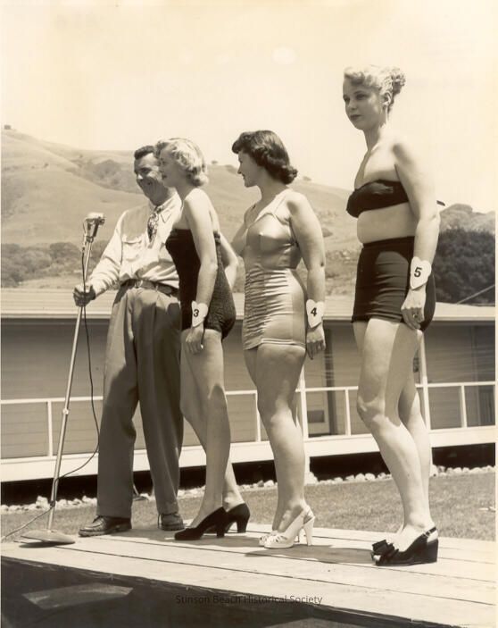 B&W photo show 3 women in bathing suits and a man with his hand on a microphone standing on an outdoor platform. A long building with running porch is in the background, and rolling hills are behind that. The "bathing beauties" (L to R) are #3-a blond in a dark one-piece suit; #4-a brunette in a shiny one-piece suit; and #5 a blond, whose hair is up in a tight ponytail, in a black 2-piece suit. The man on the far left wear slack, white shirt and tie and smiles out to the audience as if he's just introduced contestant #3.Collection