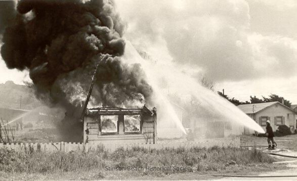 An original black and white photograph of the practice drill of Stinson Beach Volunteer Fire Department donated by then volunteer and resident, Douglas Smith. Shows a small cottage on Calle del Sierra burning and 2 firemen are subduing the fire with water. Smoke filles upper left and center of the photo. On the far right a house, the second from the ocean is visible. The burning house has a white picket fence on the side toward the ocean. Toward the highway, under the smoke, another house can be seen. A hot water heater lays on the ground in front of the house. On the back of the photo: stamped "This is not a permanent print - For Reproduction Only," May 18, 1968. Also written in pen; Practice drill for Volunteer Fire Dept. Now, Kevin Lorne property. 17 Calle Del Sierra. Dildine family owned house prior to 1950's.Collection