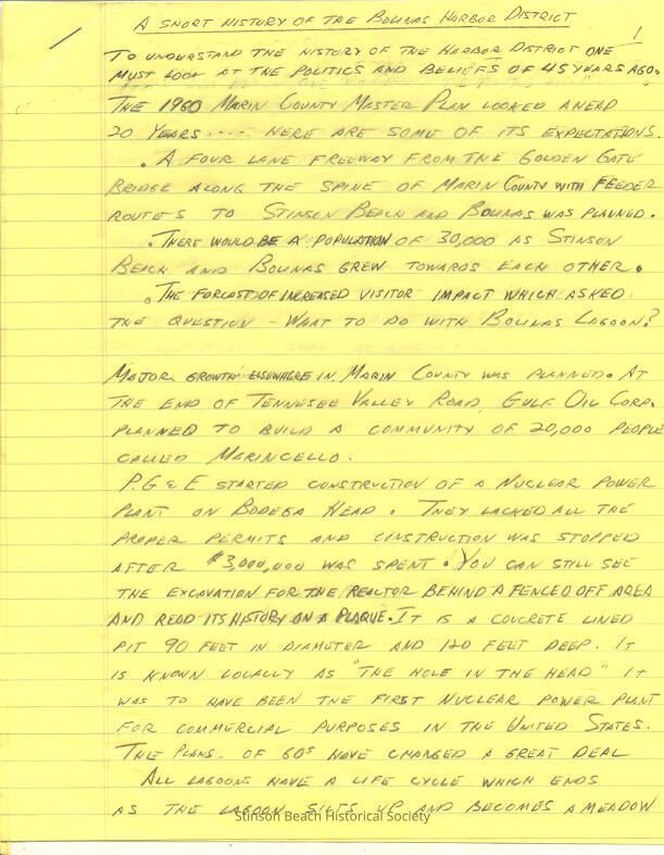 A history of Bolinas Harbor District, 1965-69, was hand written by O'Brien, Phil who run for the board of the district in 1968 election.Collection