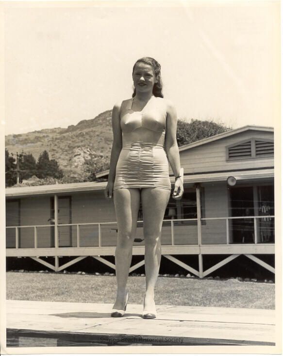 A young woman with long dark hair pulled back from her face stands on a platform in front of a frame building. There are hills and trees behind the building which has a porch running along the front, three doors and a large window. A tag is tied to the womans left wrist. She wears a one piece bathing skuit and high heels. The suit is typical of the period with a tight shirred skirt and built in bra.Collection