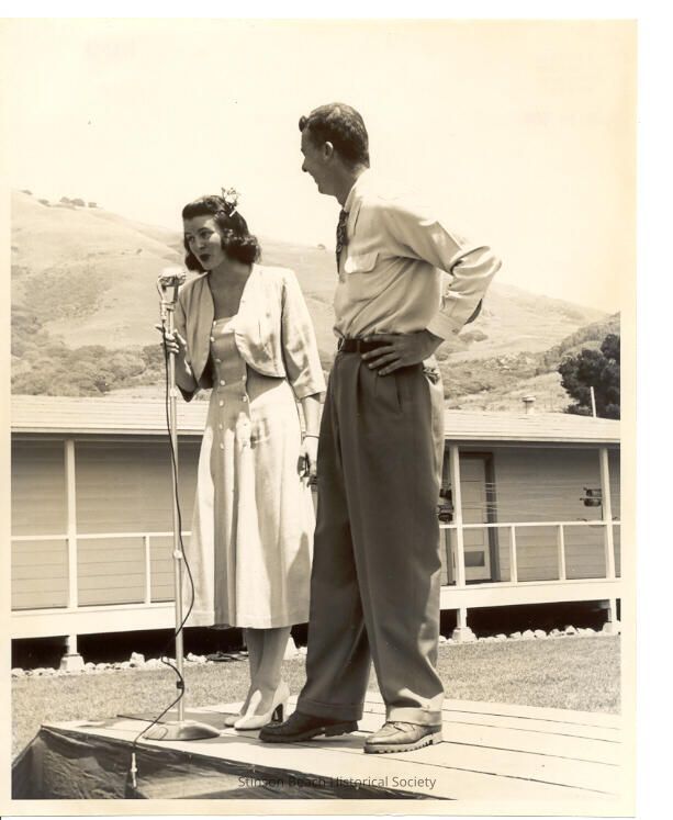 This is a black and white photo of a man and a woman standing on a platform in front of a low frame building which has a low railinged porch along its front.. She is on the left and speaking into a microphone which is mounted on a stand. She is w earing a sundress with a matching jacket and white high heeled shoes and a flower in her hair. To her right and looking at her is a man dressed in slacks, shirt and tie.Collection