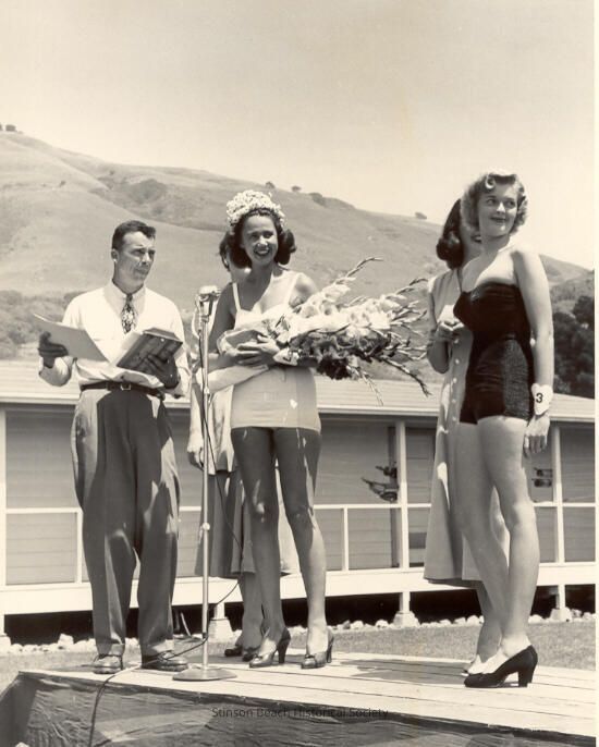 This black and white original photo is of five people standing on a platform in front of a low building. In front from left to right are a man, in a light shirt and tie and dark pants; a woman in high heels and a white swimsuit with the number 7 on her wristband and wearing a floral tiara and holding a bouquet of gladiolas; and a woman in high heels and a black one piece suit with the number 3 on her wristband. Partially visible behind the two women in swimsuits are two fully clothed women in midi-length skirts.Collection