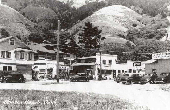 Xelox photo copy of black and white post card of Stinson Beach downtown in 1940's. It shows commercial development north of Calle del Mar. From the left, a residential looking building (rental?), Real Estate advertizing Cottage, Hillside Cottages in behind, Stinson Beach Store with CocaCola, Grey Hound, and Telephone signs, The Breaker's Restaurant, and Groceries Store in front with 4 cars parked in the side driveway. There are 2 other cars parked on the Highway 1. On the area presently the Village Green "Stinson Beach, Calif" is printed. The hills of the Stinson Beach are behind the commercial development.Collection