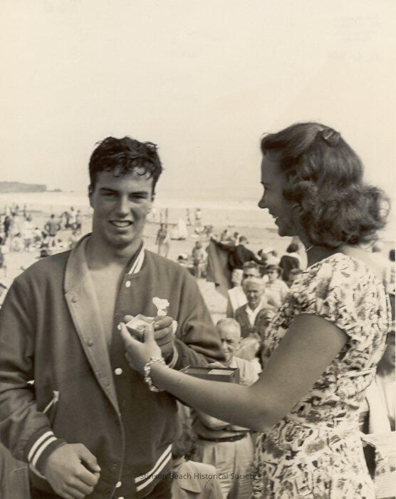 A black and white photographic print of the presentation of a medal to a young man in an athletic jacket over a bare chest. The prize is presented by a dark haired woman in a print dress. In the background the beach is crowded with swimmers and sun bathers. In the foreground behind the winner are people in street clothes watching the presentation.Collection
