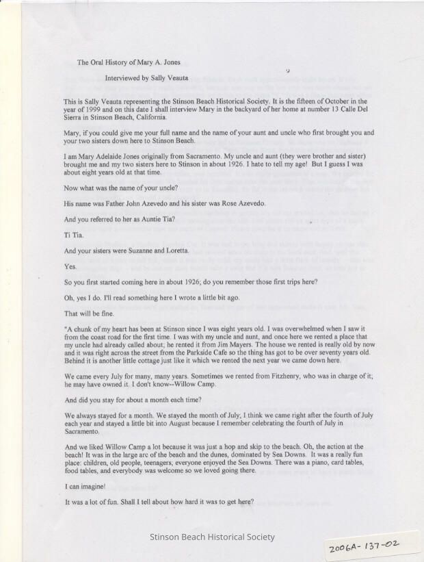 Mary began coming to Stinson in 1926 (age 8) from Sacramento and describes the two routes. She recalls Willow Camp, Seadowns, Poison Pond (then called Blue Lake with snakes) and the hots springs at the south end of the beach. She and her sister Loretta have owned property on Calle del Sierra since the 1950s. She raised 4 children, studied art and specialized in sculpture in her later years.Collection