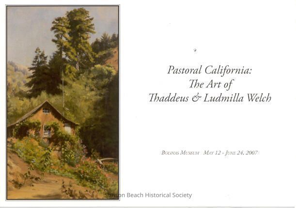 An invitation and announcements card for a Bolinas Museum show titled "Pastoral California: The Art of Thaddeus & Ludmilla Welch" in color. The front side of the card has a color photo of Thaddeus Welch painting of his and his wife, Ludmilla's house built in the Steep Ravine near the Highway 1; and The title of the show and the place, dates of the show; Bolinas Museum May12-June 24,2007. The backside of the card has the same information plus other shows shown concurrently at the museum's Photography Gallery, Coastal Marin Artists Gallery, Permanent Collection Gallery and History Room. The card was sent to Tamae Agnoli.Collection